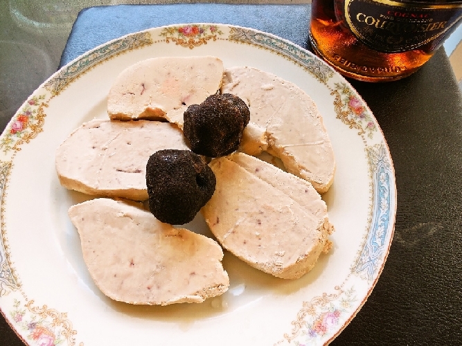 今年のお節料理は一年間の感謝を込めてグルメミートお節を、 ○グルメミートお節フォアグラ・トリュフは一度ラップや付近で包んで湯煎にかける 「バロタン・ド・フォアグラ(Ballotin de foie gras)」を作ってみたかったのでチャレンジ! これは今回プロのレシピを、私風に手抜きをしたものですのでうまくできるか少し不安でした。 材料と感想フォアグラ250g(今回はホールではなく100gX2と50gひとつを使用) 黒トリュフ中2個 コニャック10cc 塩コショウ適量 作り方 フォアグラは今回はしっかり練るので、バッチリ解凍しました。 フォークでつぶしながら中の血管を丁寧に取ります。 フォアグラは薄くスライスして形の良いものだけを外側に巻いて、 端の部分などは刻んで中に練りこみます。 練ったものに塩コショウ、コニャックで香りを付けてまた練ります。 巻きすの上にラップを敷いてトリュフの薄切りを並べてたら、フォアグラをすしの 巻物のように並べます。 形を整えたら中に強く巻き込んでラップで包み、両端を持ってクルクル回します。 ぱんぱんになったら両端を縛り、もう一枚同じようにラップで包んでクルクル回して両端縛って出来上がり。 88.8度のお湯で15分湯煎しました。