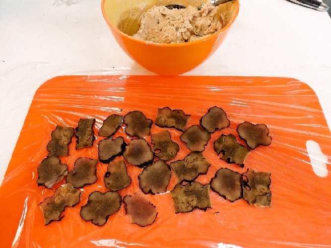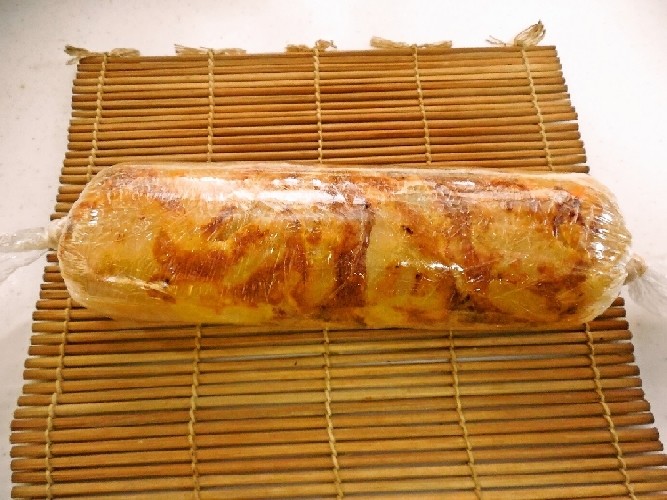 うん!うまくできました。表面にトリュフびっしりついて良い感じです。 あとの料理はレシピをこのホームページに載せさせて頂いたので、チョリソを使ったトルティージャを お重に入れるために、伊達巻風に巻いてみました。 ラップで同じように巻いてうまくいったかに見えましたが、やはり冷やして切ったら少しジャガイモを