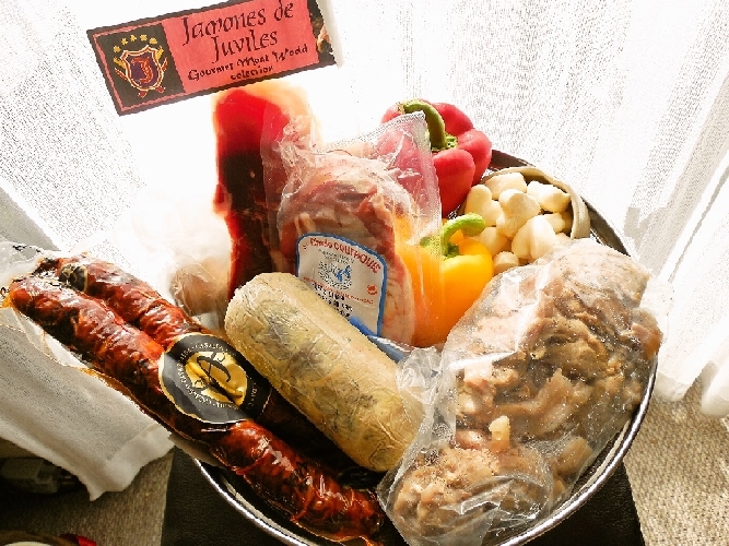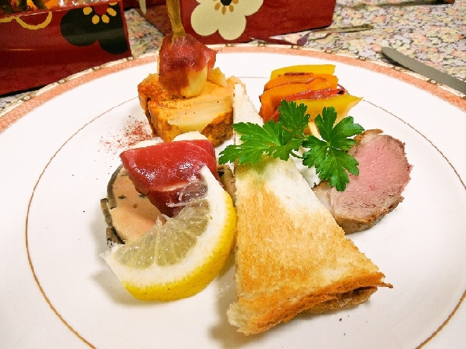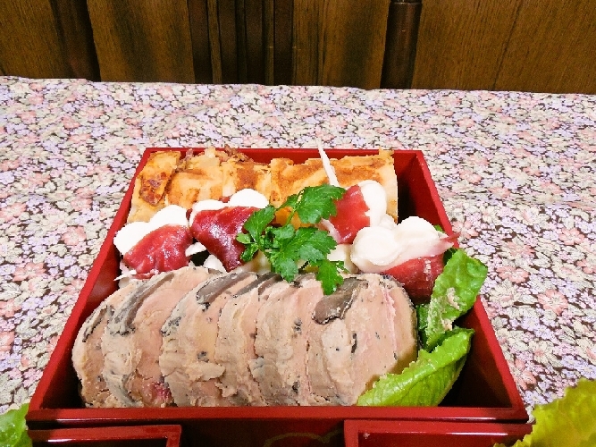煮凝りのようになる予定でしたが少し硬さと冷やし方が足りなかったようです。 ○真ん中がくわいを蒸したものとパプリカ、レンコンをフライパンで軽く炒めて生ハムを挟んだものです。 こだわりとしてはくわいには生ハムスライスを、上の二品には原木から少し厚めに切り出しております。 右上のお重が下から ○フォアグラ・トリュフ(味見しましたが物凄く美味しいです)真ん中が ○ハートの形のモッツァレラ・チーズに生ハムを巻いたもの (食べるときに少し電子レンジかけてもとろけて美味しいです) ○見えにくいですが伊達巻型のトルティージャです。 右手前のお重が手前から ○サンドイッチパンを麺棒でつぶして生ハムを挟さみ、トースターで焼いてカットしたもの。 ○ボビーヴィールのすね肉のコールドミート(色々なソースをかけてワインに合います) ○シャラン鴨胸肉のロースト(冷めても美味しいです) という訳でこれを明日の元旦にオードブルとして親族全員で食べます。