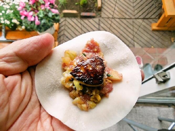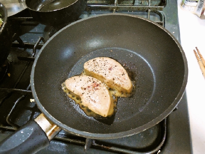 餃子も春巻きも我が家では最後までごま油入れないので 家族にお願いして自分の分の餃子と春巻きにローストしたフォアグラを焼いて入れてみることに。 はたして美味しいのか?