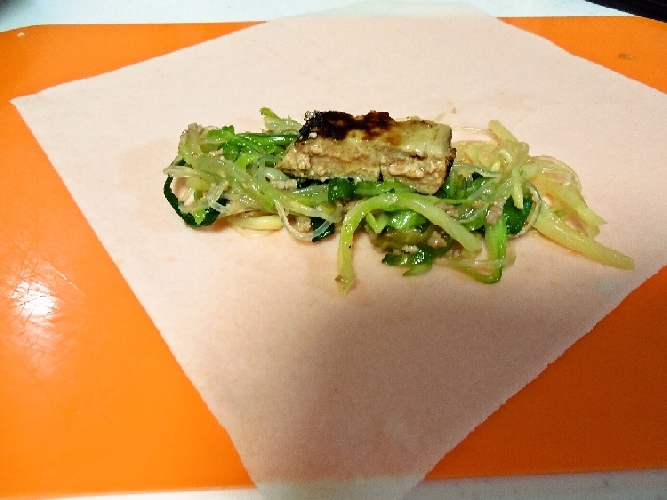 フォアグラ春巻き 千切りのキャベツは、お湯で3分ほど戻して切った春雨と筍千切りの良く水を切ったものを 豚ひき肉から炒め始めて材料すべてを炒めます。塩コショウで薄めに味を付けたら オイスターソース(意外に味が濃いので出過ぎに注意!)を少量入れてお湯を足して 沸騰したら、水溶き片栗粉でとろみを割としっかりつけます。 これもしっかり冷ましたら、春巻きの皮の上に適量乗せて、先ほどのフォアグラを乗せて 包んでいきます。 我が家の春巻きの巻き方のコツは、最初に具材を乗せたらしっかり絞り込んで成形して 一周目をうんと固めに巻きます。両側を折って巻き込んだら接着剤代わりの水溶き片栗粉をはじっこにつけて 、最後の一周を少し緩めに巻いてしっかり留めます。