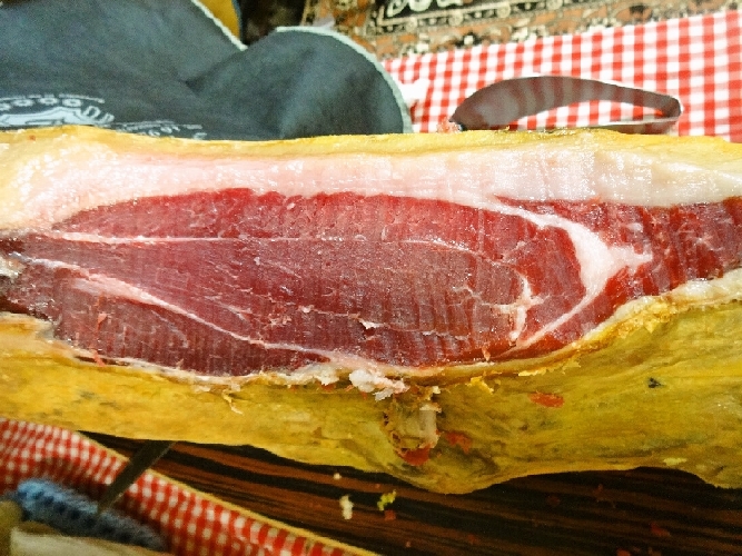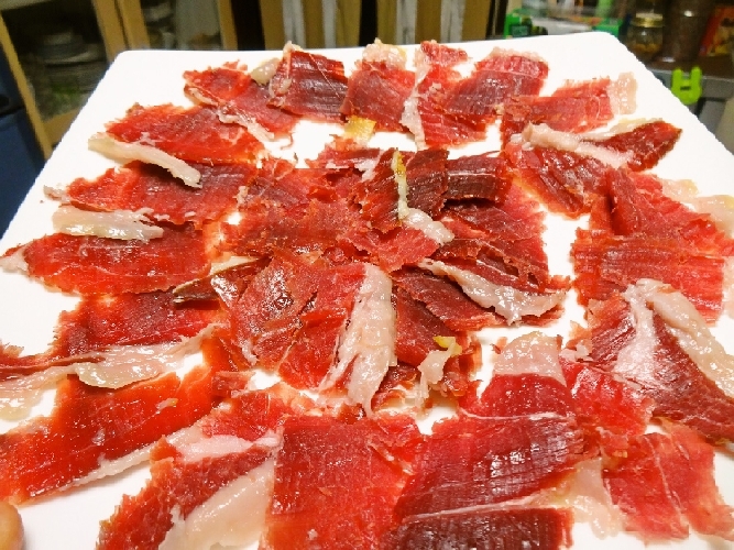 早速味見をすると! 肉質がしっかりしていて、味に深いこくと少し歯ごたえがあります。 鶏でいいますと地鶏のお肉の美味しさといったらよいでしょうか。肉の中には入っていない脂の部分も、 くどくなくて癖がありません。 もしベジョータを特上の大トロと例えるなら、まさに特上の赤身です! ただし、一つ困ったことがありました。原木生活も5本目でだいぶカッティングに慣れたつもりでしたが、 切るのが難しいのです。つまり極上のセラーノやベジョータのように肉の中にサシや入っていますと、 溶けながら蝋のように薄くスライスできますが ロースのような肉質なので薄く切りすぎると、ホロホロに崩れてしまします。 まあ、でも家庭ですのであまり気にしなくて良いでしょうし、生ハムのナイフも初めて