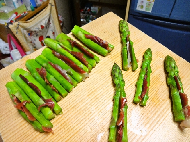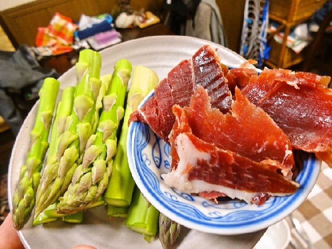 マサ(腿肉)の部分に霜が入るとどんな感じかも楽しみです。 ![]() パピージャ切り始め ![]() 盛り付け ![]() アスパラと料理してみます ![]() 熱々のアスパラの切れ目の生ハム入れます ![]() 完成 ![]() アップ | ||
