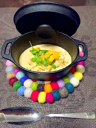 ③ 牛乳を沸騰させないように 鍋で温めます。温まったら、野菜だし、オルフォ酒入りフォアグラ・ムースを入れ、溶かします。
