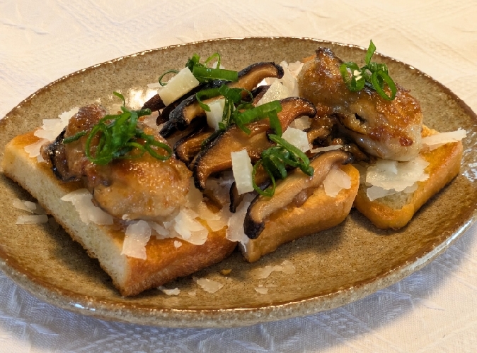 ①チーズを削っておきます。(スライスでも良かったな、と思いました。) ②牡蠣に小麦粉を軽くまぶして、バターでソテーします。火が通ったら最後にポン酢を少し絡ませます。 ③シイタケを薄切りにして、バターでソテーします。しんなりと火が通ったら、ポン酢を少し絡ませます。 ④パンにオリーブオイルを少し塗り、トーストします。(オーブンでも、フライパンでも、パンがサクッとならばOK) ⑤トーストしたパンに、①のチーズをたっぷり乗せ、②の牡蠣を乗せたものと③のシイタケを乗せたものを作ります。 ⑥最後にコネギを散らして完成です。