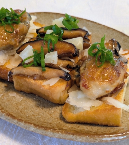 ミルクのコクが強く、甘い風味のこちらのチーズを、キレのあるポン酢と合わせたいと思って、 ポン酢味にした牡蠣とシイタケでブルスケッタ風にしていただきました。(簡単なお料理で恐縮です。。。)
