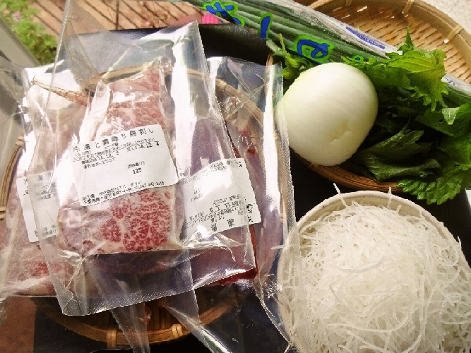 材料:3~4人前馬刺し:上霜降り・中霜降り・赤身各1本ずつ 大根つま1パック 薪玉ネギ中1個 小口ネギ1/3本 生姜小1個 紫蘇の葉4~5枚 黄身2個 ニンニクすりおろしおおさじ2杯(チューブ) 醤油・ごま油・ポン酢・ミネラル・ハーベスト塩・黒コショウすべて少々