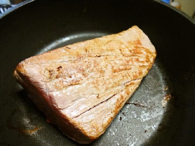 作り方馬刺しは全て氷水解凍ですが、各部位で切る厚みなどで変化を付けるために 時間を変えました。すべて芯がまだ凍っている状態で調理を始めています。 まずはたたきにする中霜降りを塩コショウして、何も入れない中火のフライパンで 焦げ目を付けます。まんべんなく焦げ目を付けたら、お皿にとって冷蔵庫で表面を冷やしますが、 食べるために切るときにまだ中心は軽く凍っている程度にとどめました。 同じくらいの状態で上霜降りを薄くカットします。
