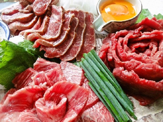 いつもおいしく頂く,グルメさんの馬刺し。 今回は上霜降り・中霜降り・赤身の3種類を贅沢に異なった調理法で 食べ比べる事にしました。