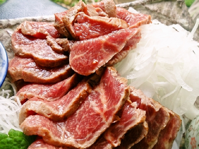 馬刺しを3種盛で楽しむのでしたら絶対にお勧めの食べ方です! ![]() 材料 ![]() フライパンで叩きを製作中 ![]() 出来上がり全容 ![]() アップ! ![]() 上霜降りアップ ![]() 中霜降りたたきアップ ![]() 赤身ユッケアップ | ||