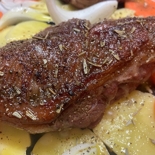 1.常温に戻し脂に切れ目をいれたお肉に塩・胡椒・ハーブをすりこむ