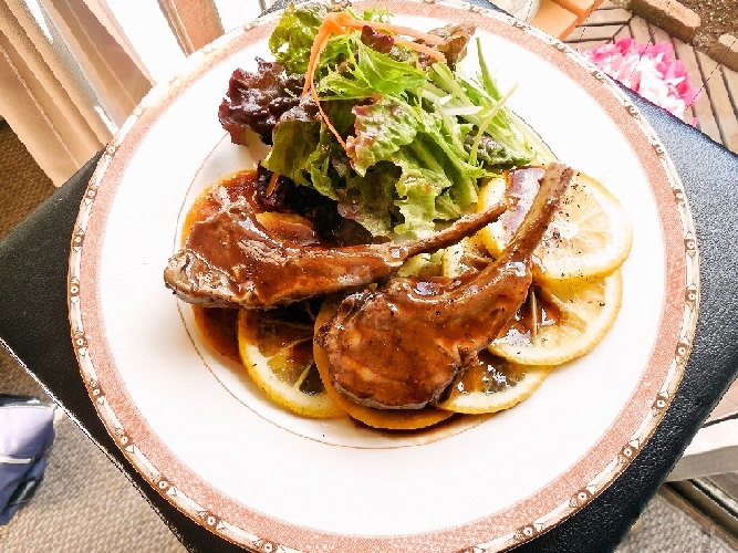 お皿にリーフレタスと水菜を敷いて(写真のポテトもミニ・トマトも急いでいたら盛り付け忘れました) カボスの真ん中のを厚さ5~7mmほどに切って種を取ったものを並べて、ラムチョップを乗せて ソースをかけて出来上がり。上からカボスの端っこの果汁も絞って足しました。 感想切って口に入れると肉質は柔らかく、カボスのさわやかな酸味とバルサミコのローストした香りが良く合います。 カボスは大きくなり甘みも増していたので余計にそう感じたかもしれません。 何よりカボスとバルサミコ酢とラム肉はピッタリ合います!逆にこれだけ黄色いカボスは入手困難でしたら、 最近はやりの果汁のビン詰でもいけるかもしれません。 レモンとはまた違ってやさしい香りと酸味でラム肉を楽しみました。 ちなみに湯煎は中の火の通りを気にして行ったのですが(柔らかさは出ました)