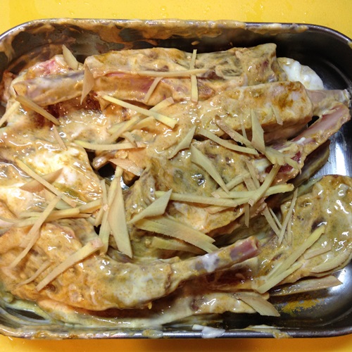 1.ラムショップに軽く塩をふってから、ヨーグルト、カレー粉、生姜の千切りをまぶして漬け込んでおく(30分~1時間)。