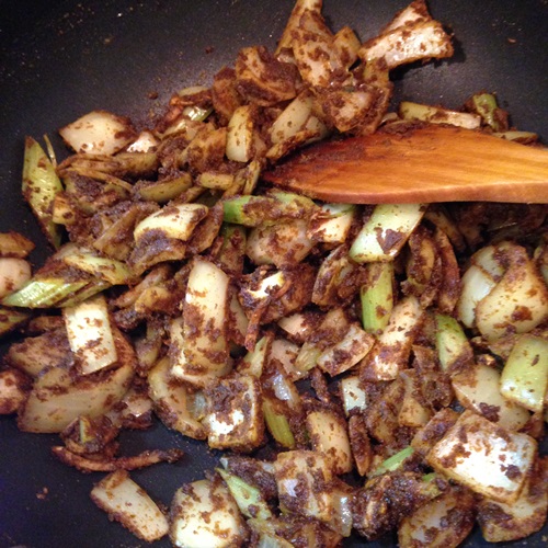 3.同じフライパンにオリープオイルを入れ、ニンニクを玉ねぎ、カレー粉の順に入れてよく炒める。