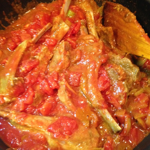 4.トマト缶を入れ、ラムチョップを戻し、沸騰したら4~5分蓋をしておく。これで水分が出てきます。