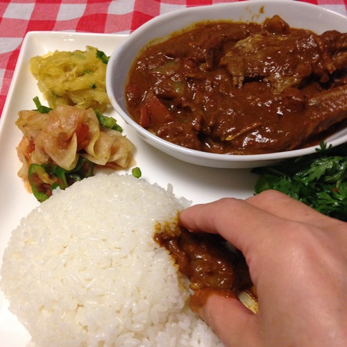 ラムチョップで、骨から肉を外すことなくカレーにし、かなりマイブームの「手食べ」としました。手食べは豪快なようで、実は五感を刺激される繊細な食べ方でハマっていて、大好きなラムを満喫できました。