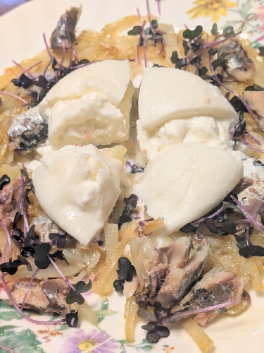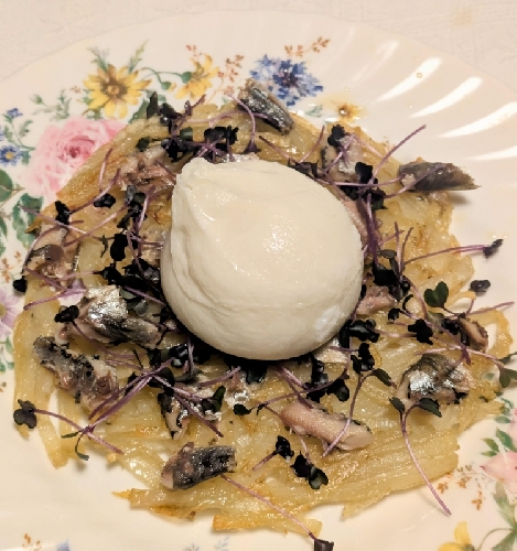 「ブラータチーズとガレット」 【材料】 ブラータチーズ ジャガイモ オイルサーディン レッドキャベツスプラウト オイル