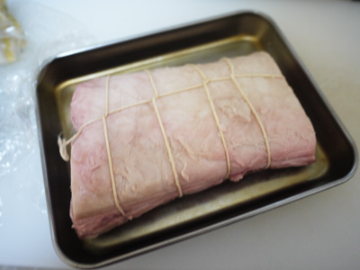 ①羊肉に少し筋が付いていたので取り除き、ロース糸をかけます。