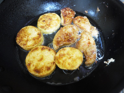 ④フォアグラ、米ナスに打ち粉をし、オリーブ油を流したフライパンで焼いて温かい場所で保温します。