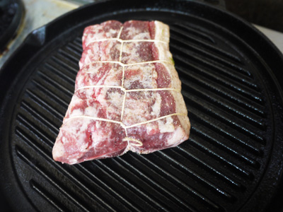 ②グリヤード(グリルパン)を温め、羊肉を脂身の面から焼いていきます。