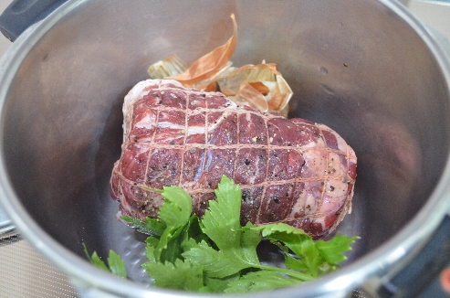 2.圧力鍋に玉葱の皮とセロリの葉とローリエ、塩漬けのお肉、かぶる位のお水を入れて中火にかけ、