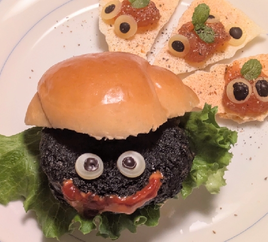 ①ハンバーグを作ります。 タマネギが苦手な方が居たので、タマネギを入れずに作りました。 挽肉に塩を少し入れて、よく混ぜ、卵と片栗粉とイカ墨を入れてさらに混ぜ、フライパンで焼く。 ②ハンバーガーを作ります。 パンを開いて、中にマヨネーズを薄く塗り、サラダ菜と①ハンバーグを入れる。 ③ハンバーグに顔を作ります。 あらかじめ、スライスチーズを円の形にくり抜き、無糖のカカオマスを溶かしたもので目玉を描き、冷やしておきました。 ハンバーグに目玉を乗せ、ケチャップとマヨネーズで口を描きます。